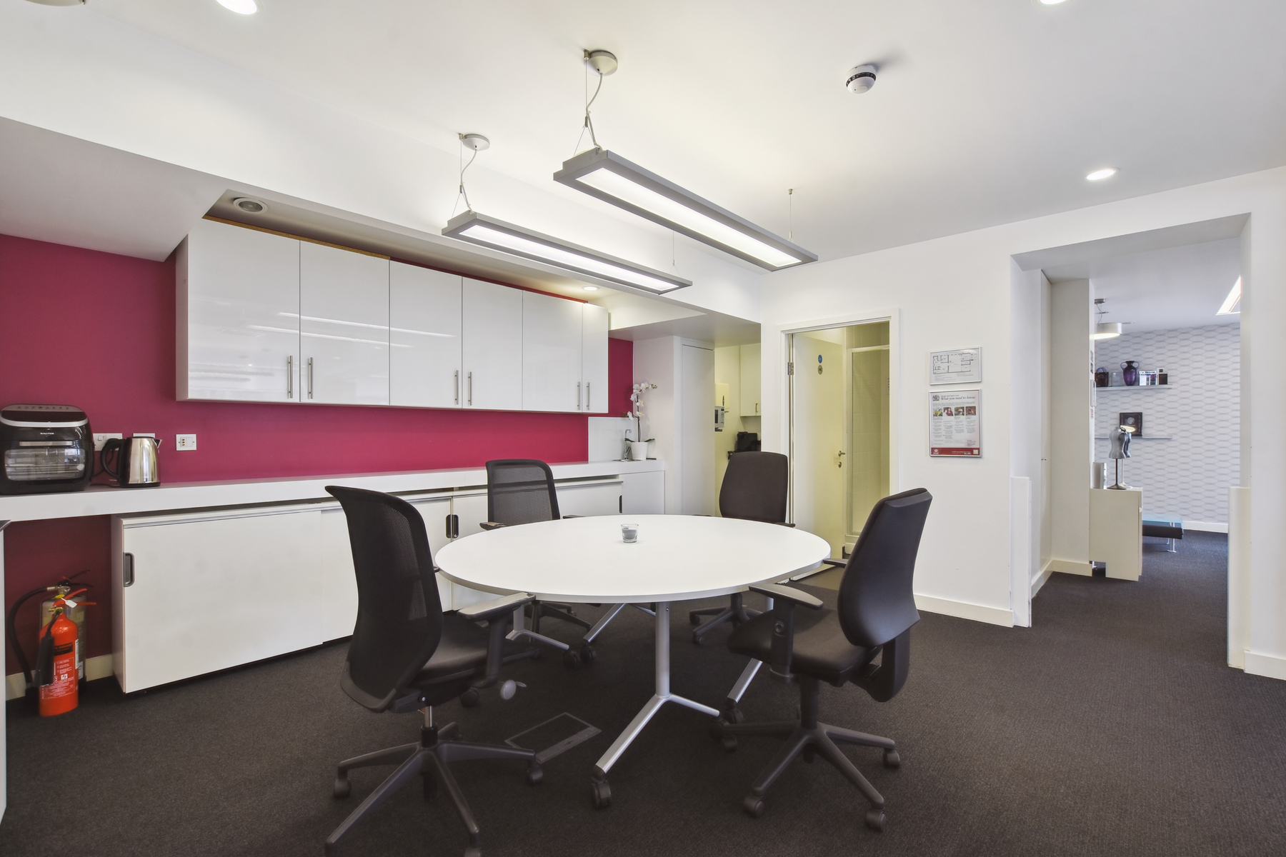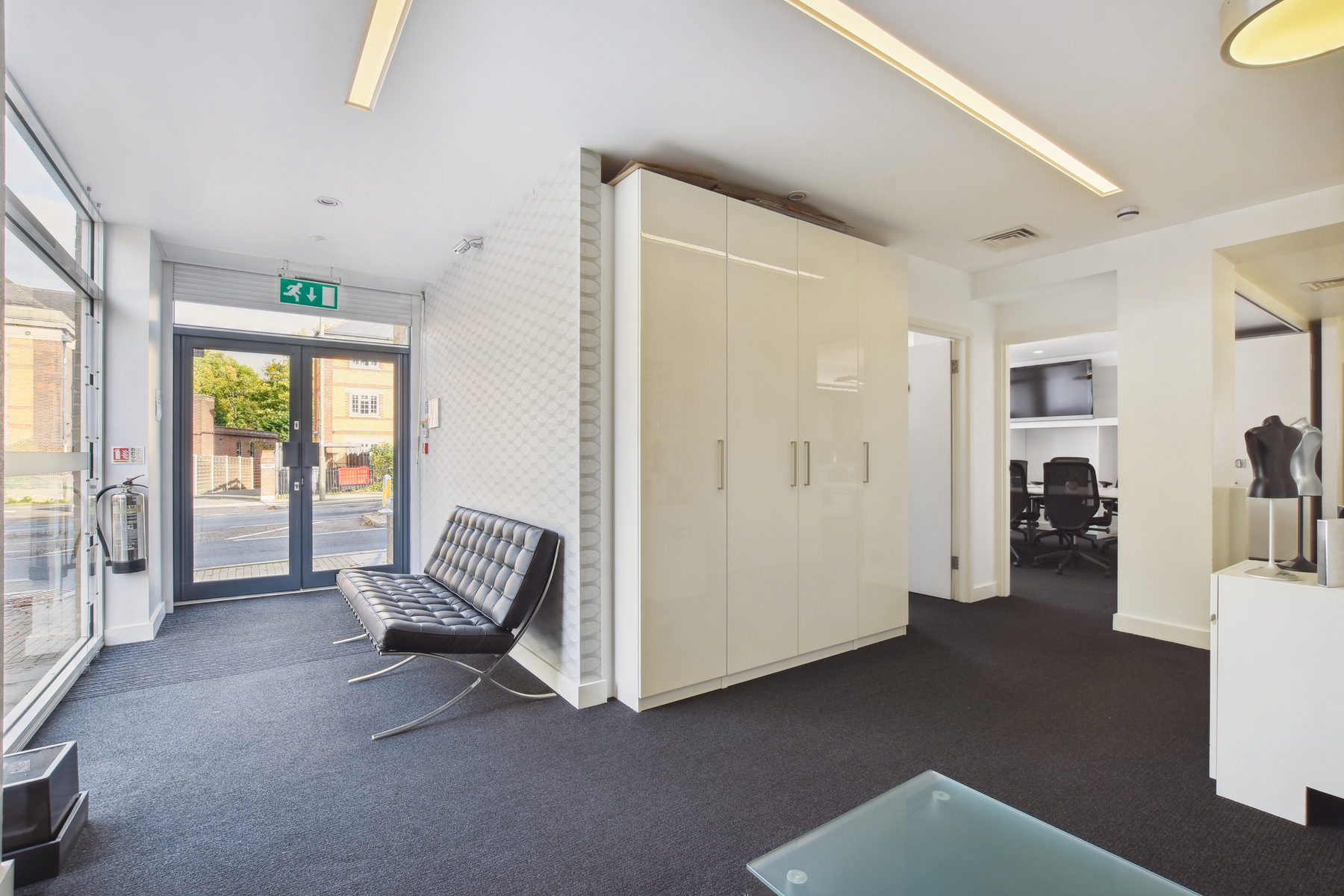 Description: Well appointed bright and spacious Ground Floor offices, offering triple aspect views, being approx 2,100sqft GIA, offered in good condition throughout. Internally, the premises are arranged as two large rooms, with smaller meeting rooms and offices set off the main area. The space is designed to be flexible with sound-insulated folding partitions opening to create a large presentation area or closing to offer discreet rooms. Externally, the unit is imposing and highly visible from all directions allowing use of the all-round windows for branding if desired.